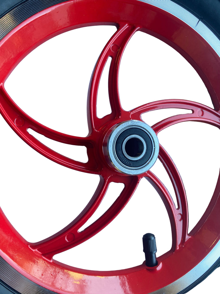 12" red alloy go kart wheels and axle set are equipped with all-terrain profile pneumatic tyres for any surface.
